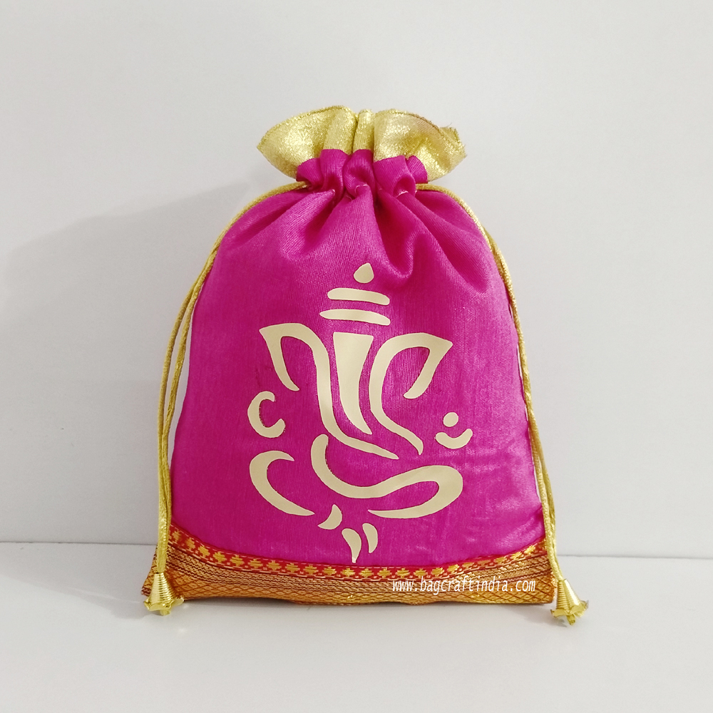 Ganesha-themed potli bags are a delightful and festive way to present gifts during religious events, especially Ganesh Chaturthi, Diwali, and other Hindu festivals. These potli bags are often adorned with motifs of Lord Ganesha, symbolizing good luck, prosperity, and the removal of obstacles. They make thoughtful gifts for loved ones, often used to present sweets, dry fruits, jewelry, or even small puja items.